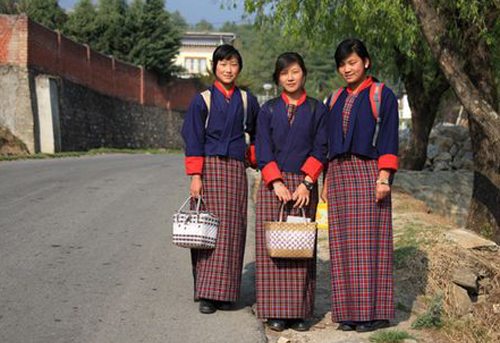 和不丹这个国家一样,与世无争的的小国到处流淌着随意和原生态。不丹的校服看着真舒服,款式随意,棉布质感天然环保,很有自然型风格的感觉。男生的校服也是不丹的男性传统服饰“帼”。女生的校服也是不丹女性的传统服饰“旗拉”(Kira)。