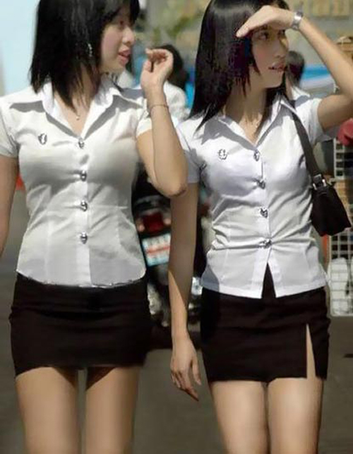 泰国学生从小学到大学在校都必须穿校服。其中,女学生的新款校服颇为性感――白衬衫改为紧身短袖式样,其紧身程度可以将身体曲线表露无遗,黑裙子则由以往的过膝宽裙改为低腰迷你褶裙,腰线刚刚及胯,裙边则短到大腿中部;为了走路方便,迷你裙的斜侧面还要开一道口子。对此,一些中老年人表示不满,认为有伤风化。有人不喜欢,有人却又远隔万里也要买买买,日本的妹子们就被泰国校服征服了,纷纷定制呢~
